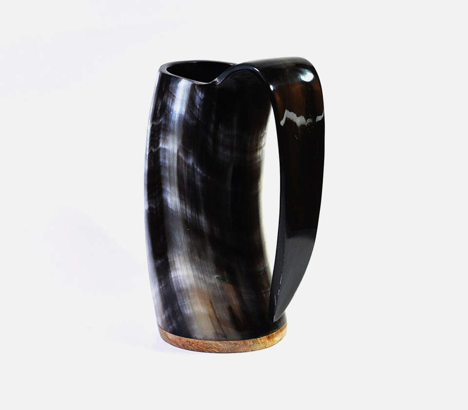 Premium Handcrafted High Gloss Black Viking Drinking Horn Mug With Authentic Solid Wooden Base Traditional Medieval Style