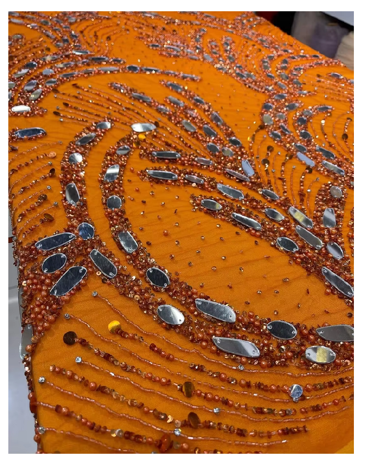 Premium Handcrafted Mesh Embroidery Fabric with Sequins Beads and Rhinestones for Evening Dress Designer Gown and Party Wear
