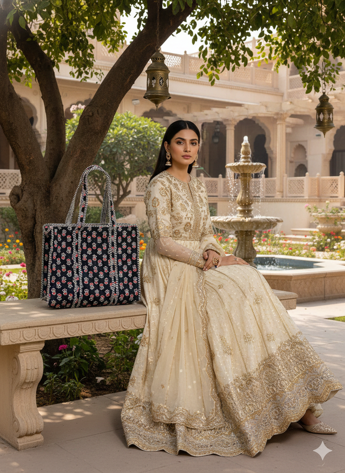 Premium Handcrafted Quilted Cotton Canvas Foldable Lightweight Tote Bag Women Eco-Friendly Ethnic Floral Pattern Large Capacity