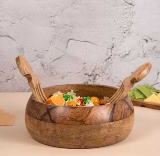 Vintage style wooden bowl with red botanical print inside ideal for serving dry snacks or enhancing rustic themed kitchen decor