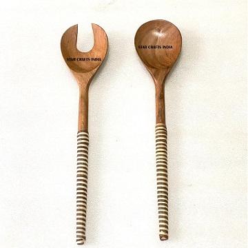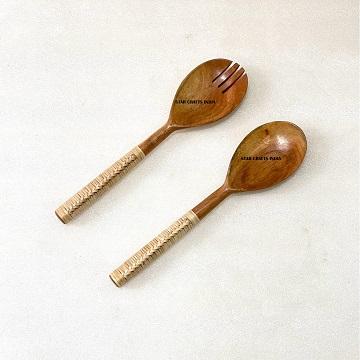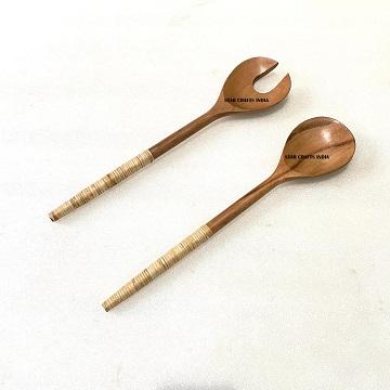 Premium Handle Design Salad Server Durable Wood Salad Mixing Dinner Fork & Spoon Long Handle Salad Server with Wicker Handle