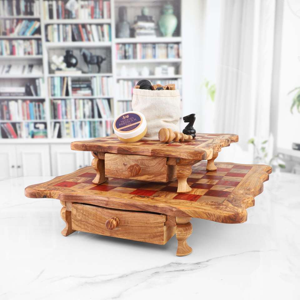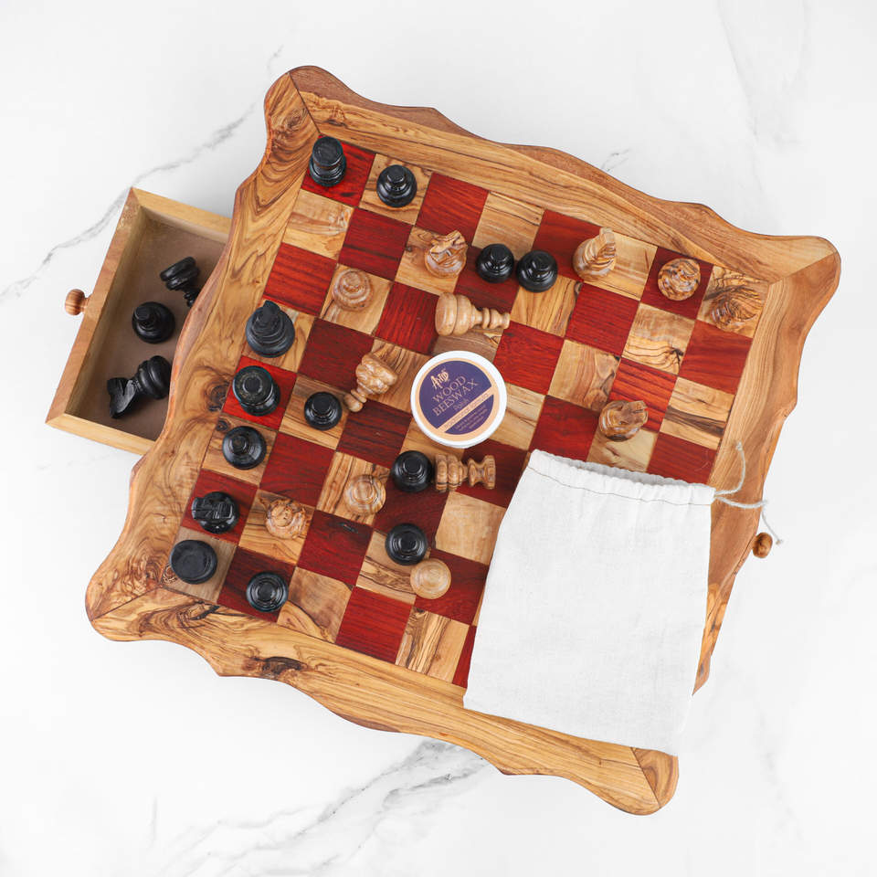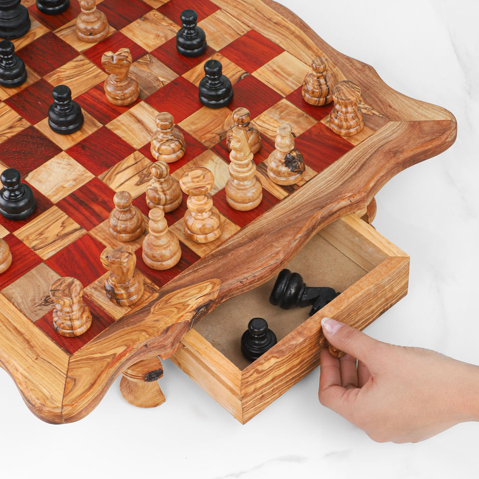 ArtisRaw Premium Handmade Chess Board From Tunisian Olive Wood with Carved Pieces and Storage Drawer