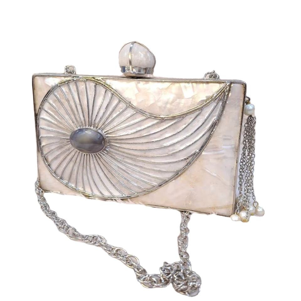 Premium Handmade Designer Iron MOP Clutch for Ladies Fashionable Suede Purse Mother Pearl Inlay Bridal Evening Wear Chain Strap