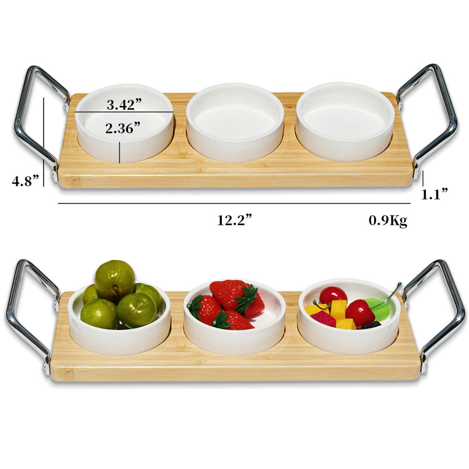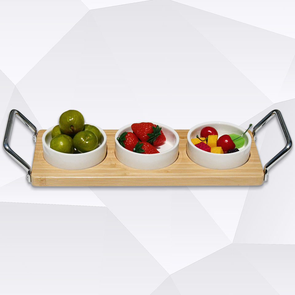 Premium Handmade Organic Natural Bamboo Serving Tray With Mental Handle, and 3 Ceramic Bowls for Nuts, Fruits Snack