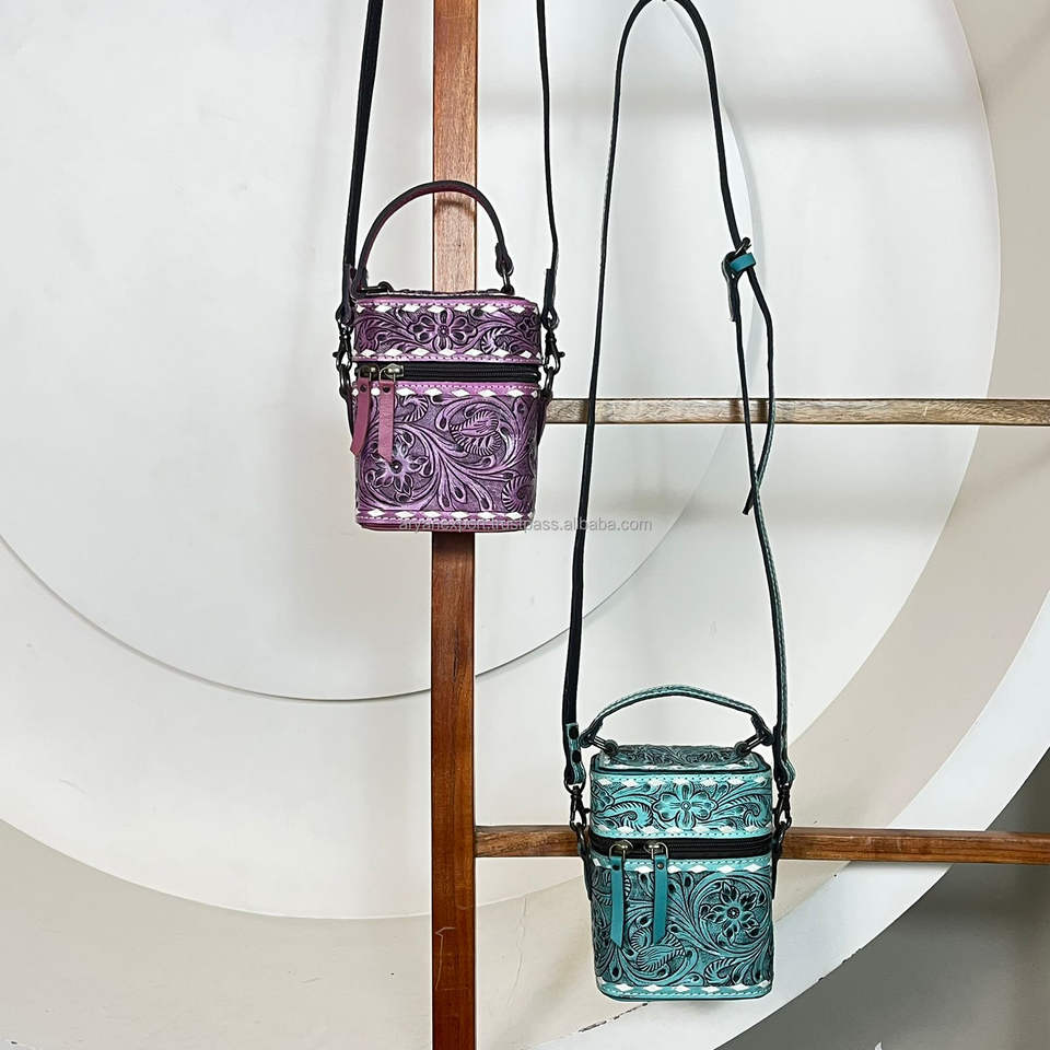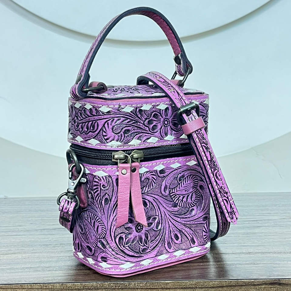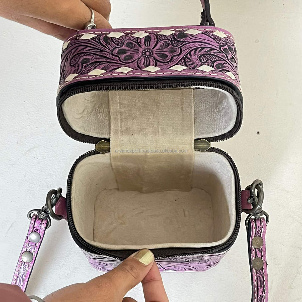 Premium Handmade Western Pink Tooled Cow Leather Cosmetic Vanity Case With Handle And Shoulder Strap Travel Makeup Organizer
