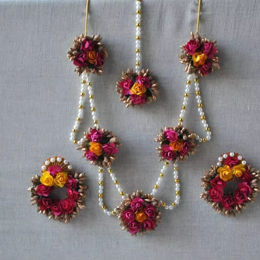 Premium Islamic Wedding Haldi Mehndi Jewelry Set for Bride with Rose Necklace Earrings Ring Tikka Handmade Floral Design