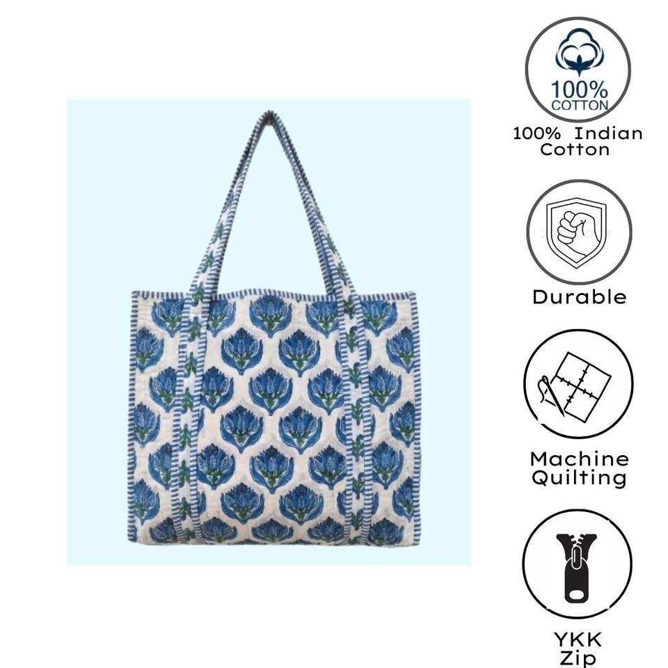 Premium Jaipur Hand Block Printed Quilted Cotton Artisanal Tote Bag Floral Pattern Durable YKK Zipper Closure Eco friendly