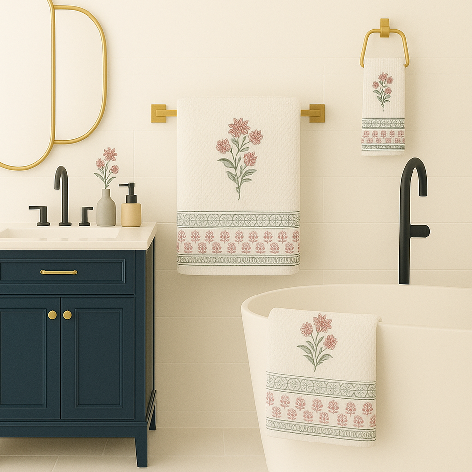 Premium Jaipuri Golf Bath Towel Set Hand Block Printed Waffle Cotton Soft Durable Skin Friendly Hypoallergenic Compressed
