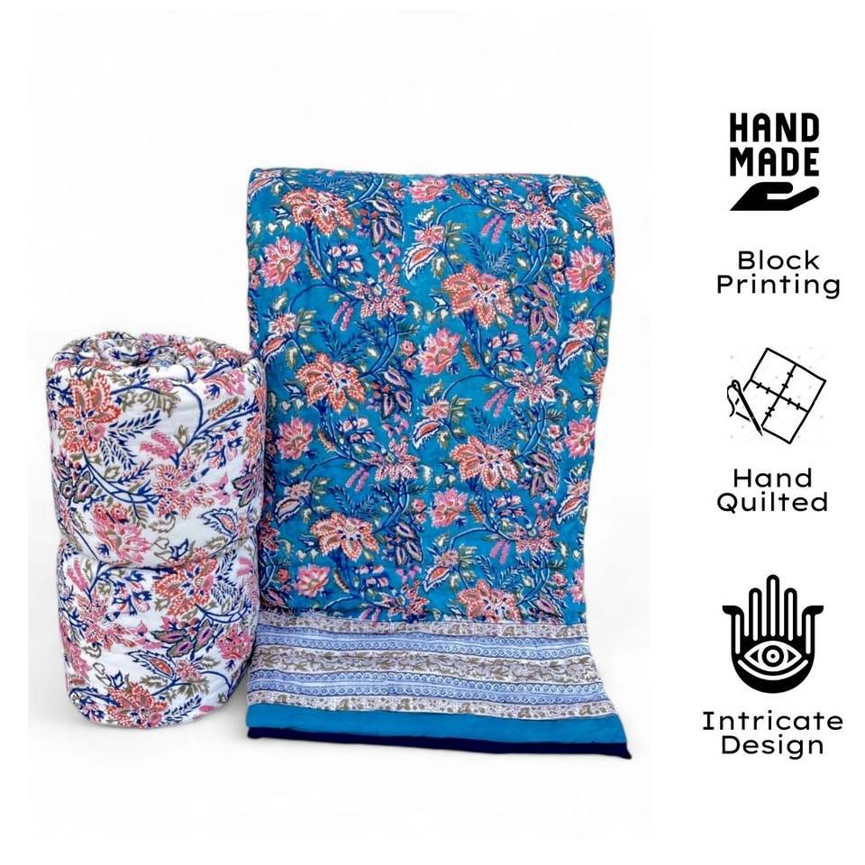 Premium Jaipuri King Size Quilt Set Hand Block Printed Floral Pattern Eco-Friendly Reversible Lightweight Cotton Blanket