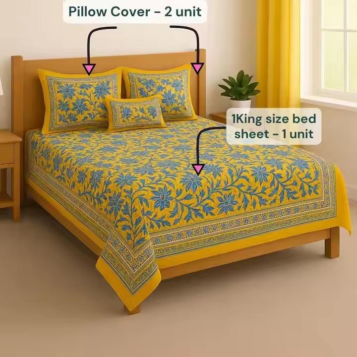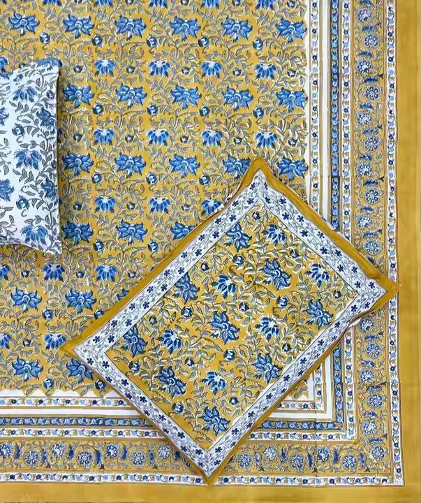 Premium King Size Cotton Bedding Set Yellow & Blue Floral Hand Block Print Machine Washable & Durable Made in India