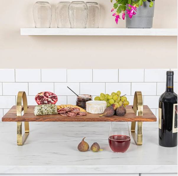Premium Large Wooden Serving Platter with Gold Stand Food Safe Acacia Wood Tray for Salad Steak Display Kitchen Tabletop Decor