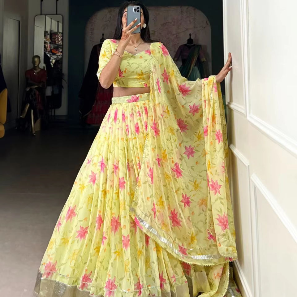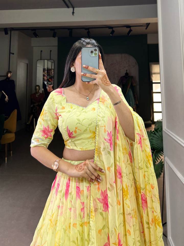 Premium Light Yellow Silk Lehenga Choli with Floral Print With Lace Touch Up Dupatta for Parties and Weddings