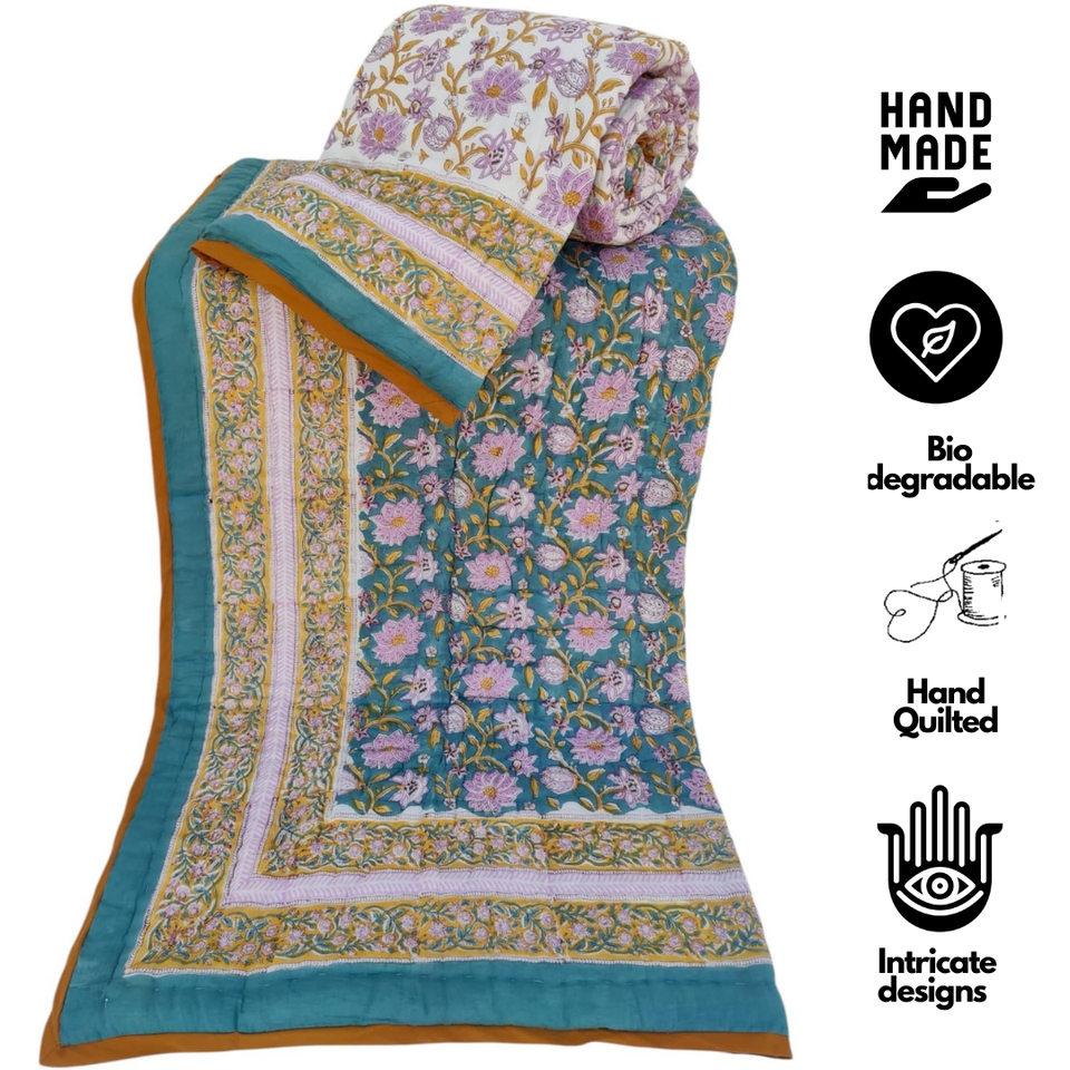Premium Lightweight 60x90 Inch Jaipuri Quilt Pigment Printed Single Bed Cover Teal Lilac Floral Cotton 300TC All-Season