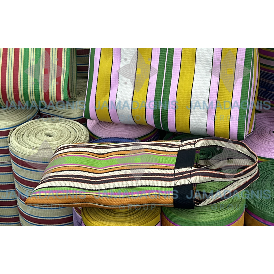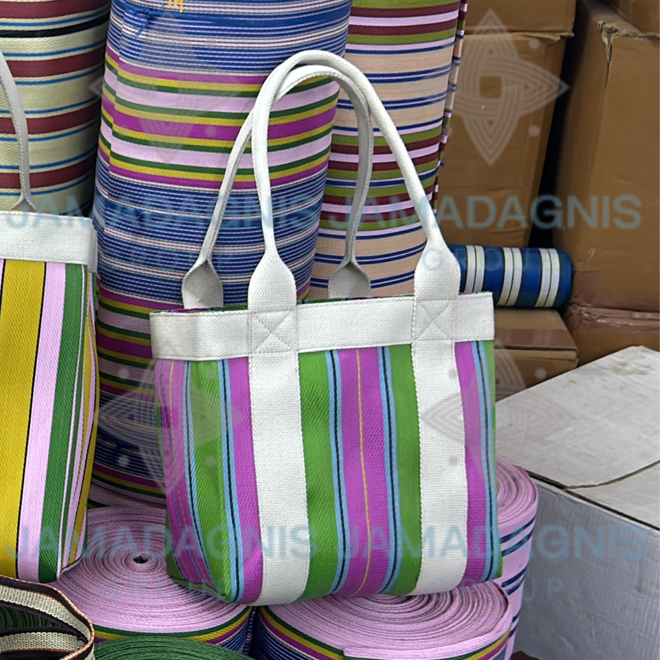 Premium Lightweight Mini Tote Recycled Nylon Shopping Bag Colorful Striped Pattern Open Closure Pocket Design Webbing Straps