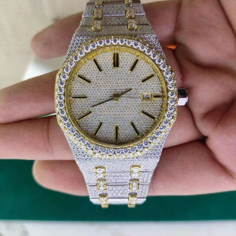 Premium Luxury Dual Tone Men's Mechanical Watch Custom Antique Hip Hop Style with Elegant Glass Display Iced Moissanite Diamonds