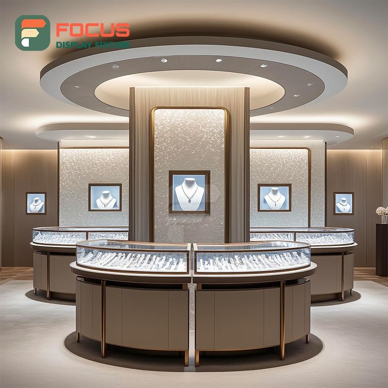 Premium Luxury Glass Jewelry Display Cabinet Wooden Metal LED Lighting Modern Retail Boutique Showcase Interior Display Stand