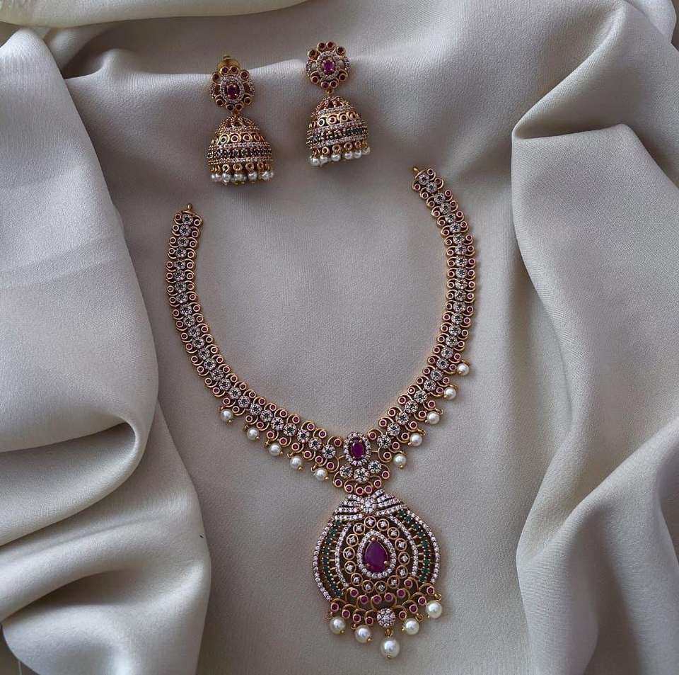 Premium Matte Finish Cubic Zirconia Necklace Set With Jhumka Earrings For Women Indian Traditional Bridal Jewelry Free Shipping