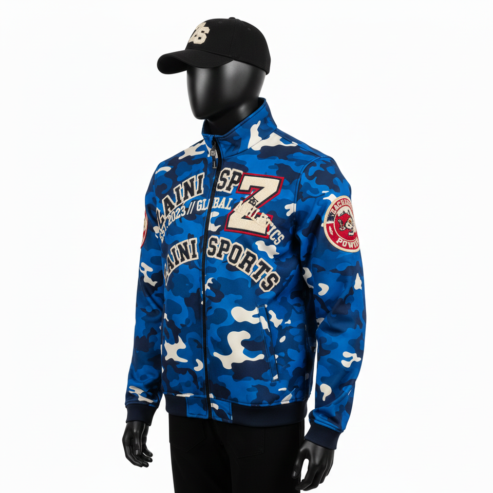 Premium Men Softshell Jacket 320 GSM Durable Polyester Spandex Blue Camo Pattern Custom Embroidery Logo softshell Jacket for man