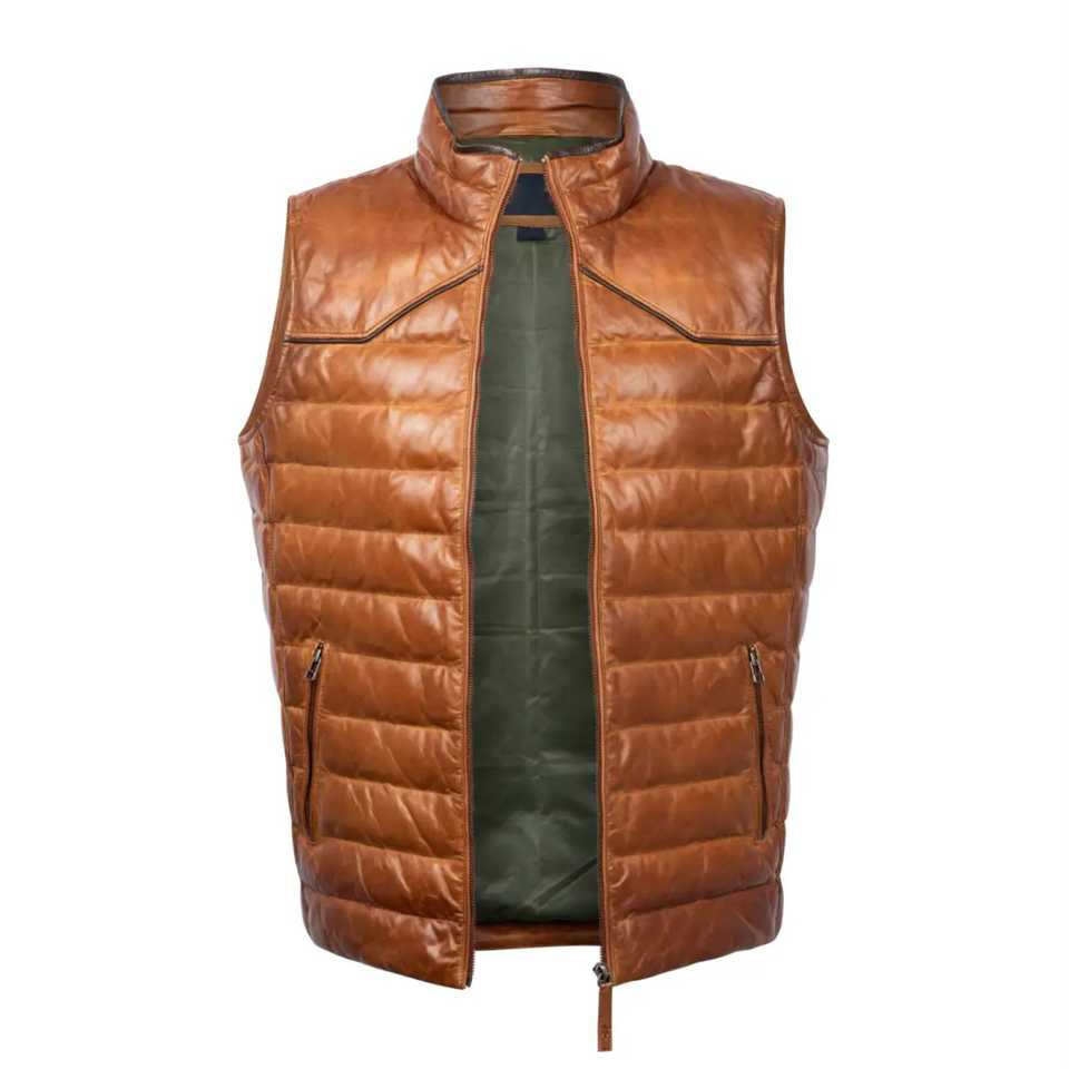 Premium Men's Sheepskin Leather Puffer Jacket for Men Real Down Quilted Puffer Coat Lightwighth Sleeveless Zip up Puffer