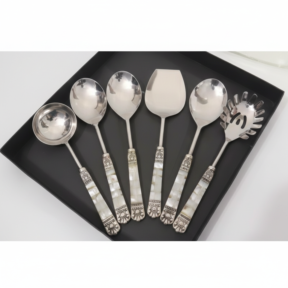 Premium Metal Salad Server Set with Mother of Pearl Handle Designer Spoon and Fork for Modern Dining Table