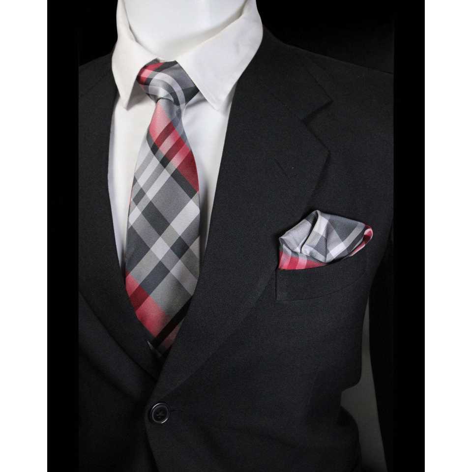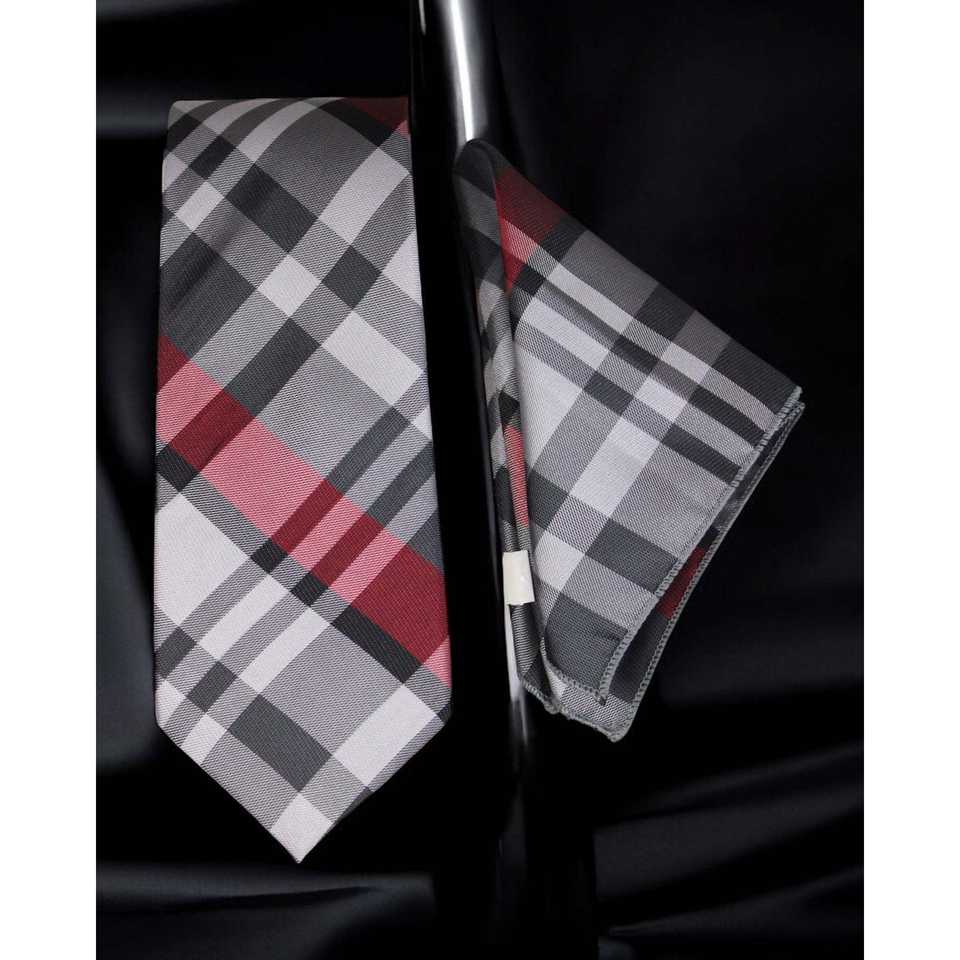 Premium Microsilk Plaid Tie & Pocket Square Set in Red Grey Black Tartan Silk Men's Formal Accessories