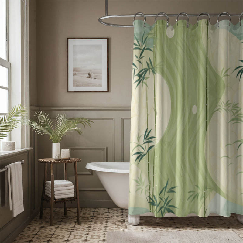 Premium Modern Bamboo Design Peva Shower Curtain Polyester Fabric with Metal & Technology Hooks for Hotels
