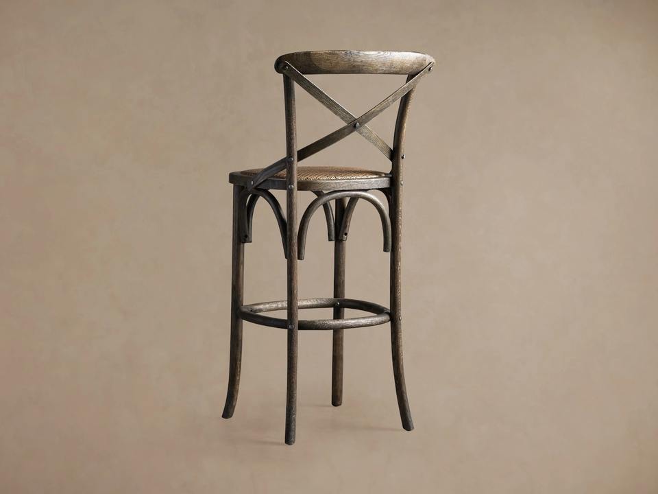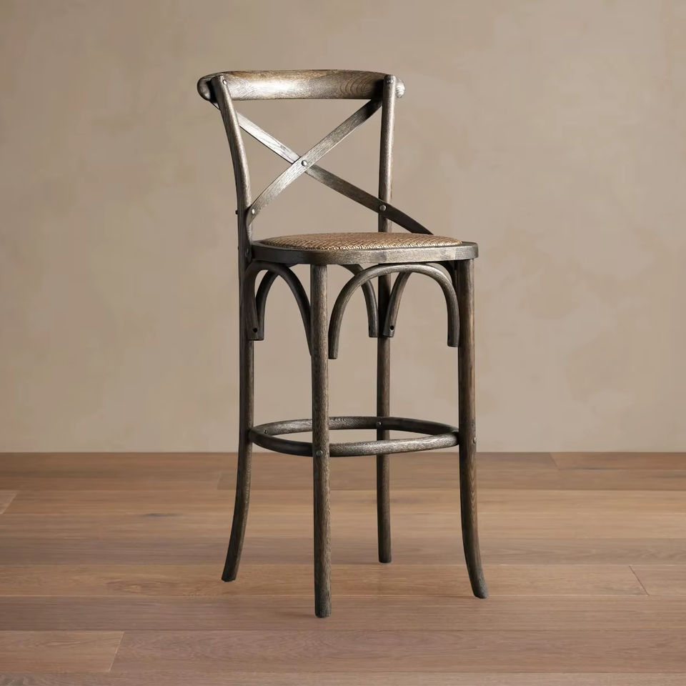 Premium Modern Cross Back Wooden Bar Chair Handwoven Rattan Seat Outdoor Bar Stool for Restaurant Cafe Hotel Hospitality Spaces
