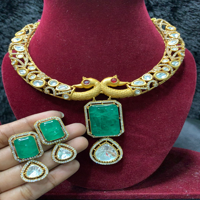 Premium Moissanite Kundan Doublet Stone Necklace Set Ethnic & Fusion Jewelry For Women Royal Bridal Choker with Earrings