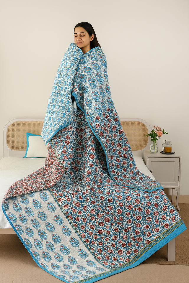 Premium Organic Cotton King Size Quilt Eco-Friendly Hand Block Printed Floral Comforter Handmade Indian Kantha Quilt Sets