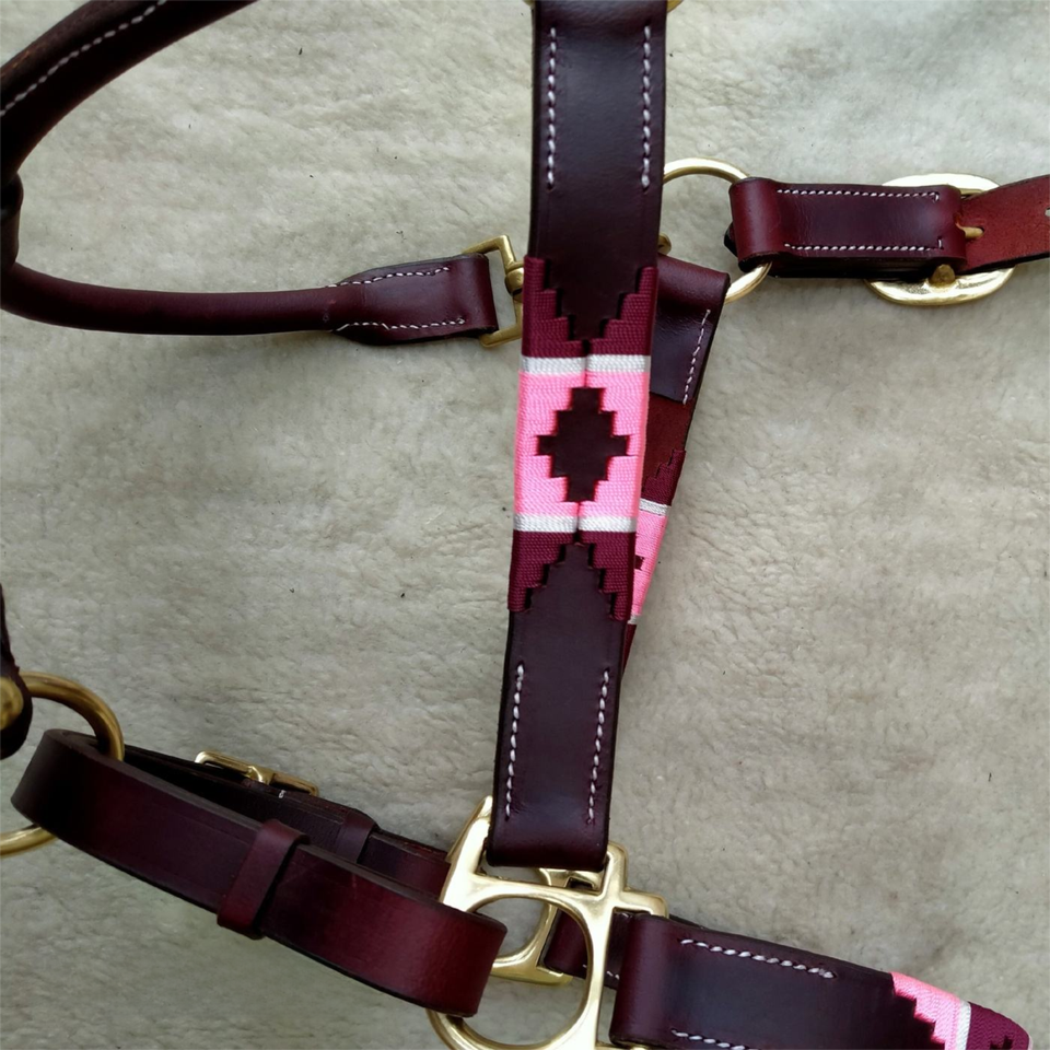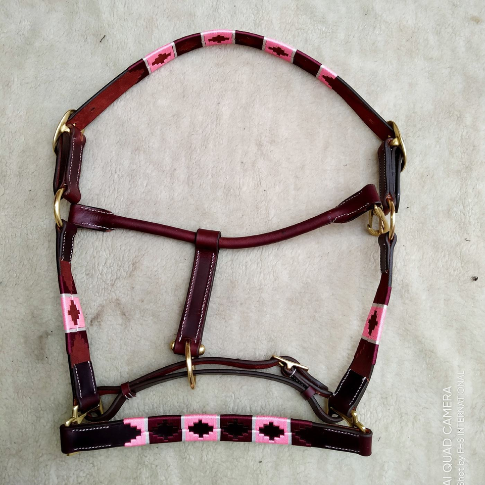 Premium Polo Leather Horse Halter Unique Chestnut Brown Leather with Pink and Burgundy Thread Stitch Design