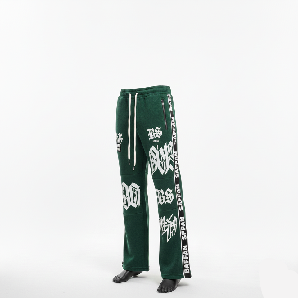 Premium Polyester Fleece Flare Pant Soft Stretch Fabric Green Black Side Panel Custom Screen Print Logo Flare Pant Men's Pants
