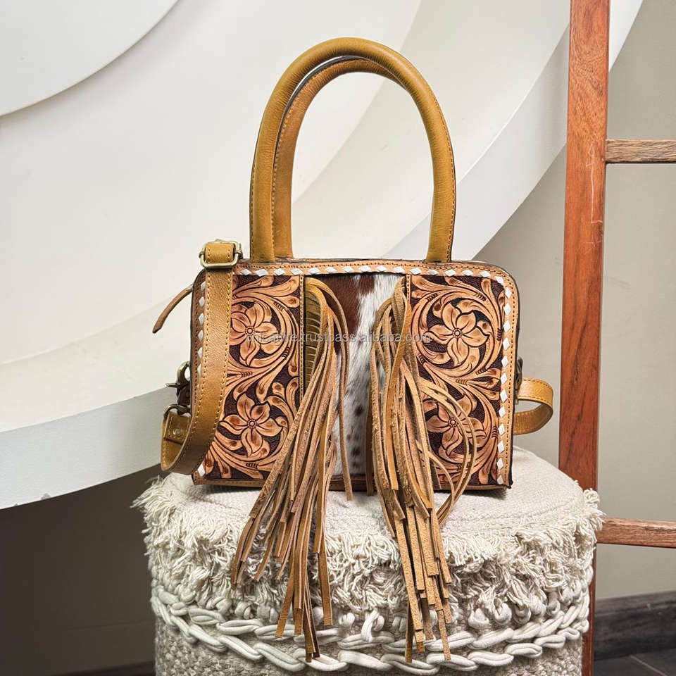 Premium Quality 2025 Hand Tooled Cowhide Leather Mini Tote Bag Fringe Adjustable Crossbody Strap Shoulder Handbag for Women's