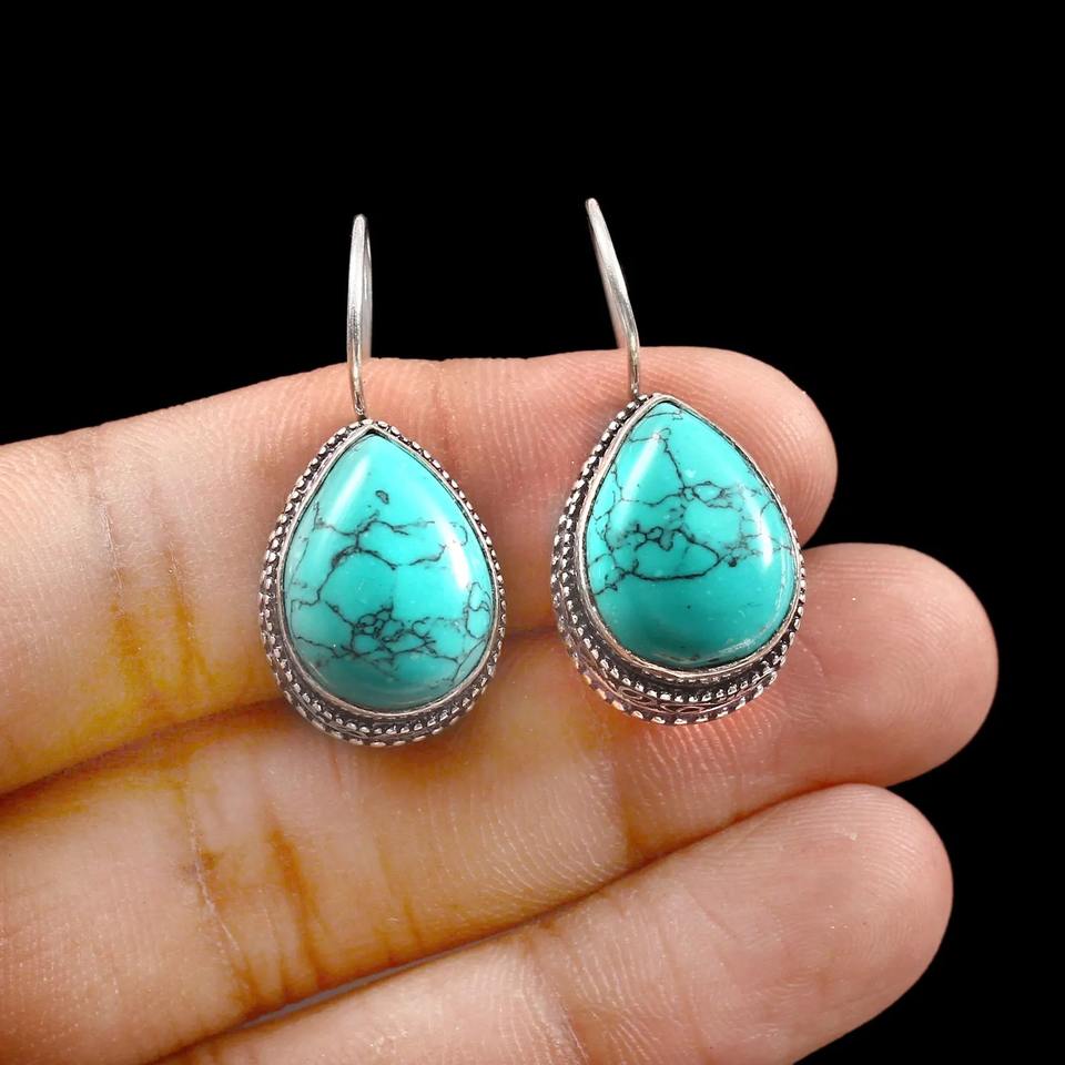 Premium Quality Blue Turquoise Gemstone Oval Cabochon Vintage Baho Solid 925 Sterling Silver Plated Dangle Drop Womens Earring