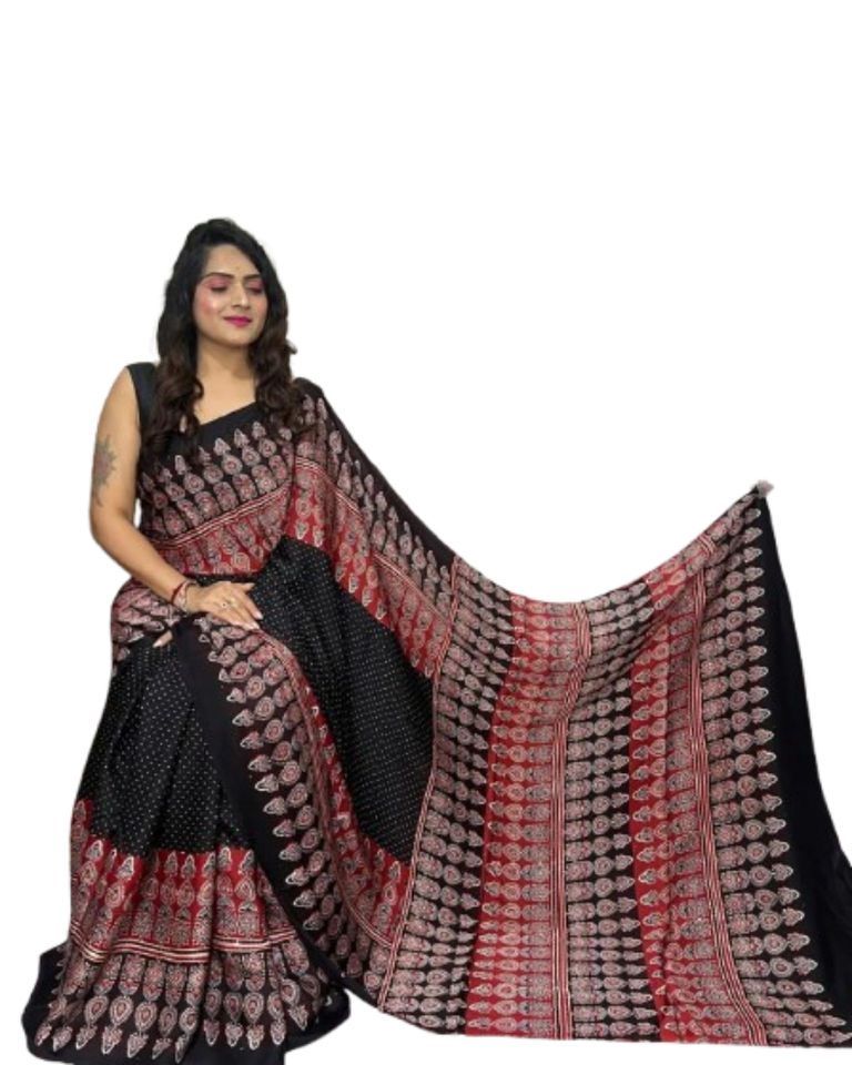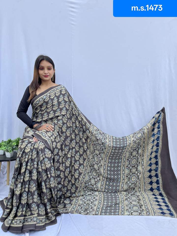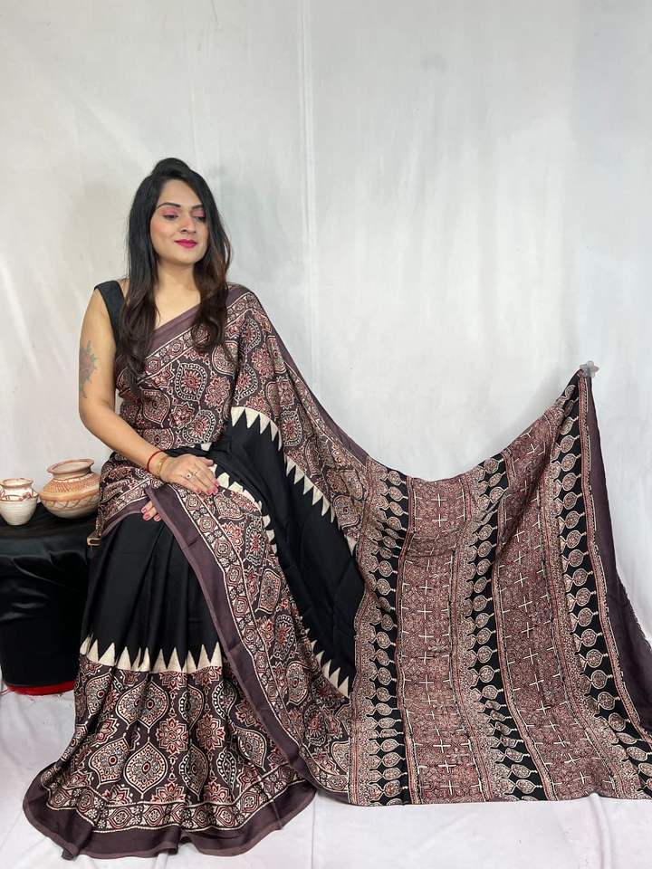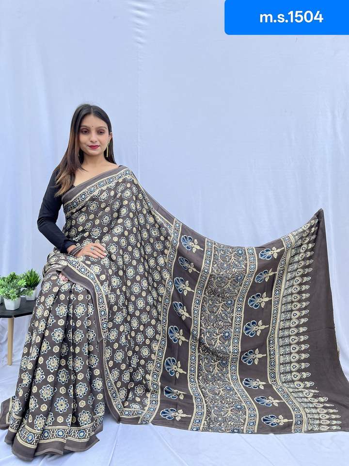 Work:Digital Print Border with Ajrakh Rich Pallu With Contrast Blouse
