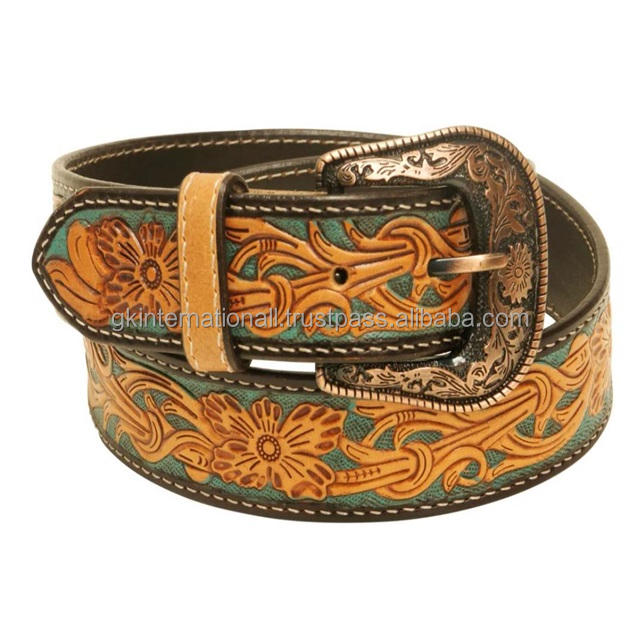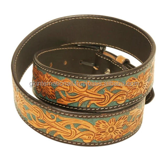 Premium Quality Cowhide Genuine Hand Tooled Western Leather Belts Custom 38mm Wide Cowboy Belt With Interchangeable Brass Buckle