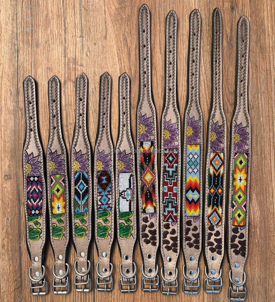 Premium Quality Cowhide Leather Dog Collar Durable Hand Tooled Leather Beaded Pet Collars for Small Medium Large Dogs Puppy Cats