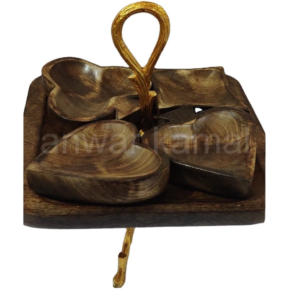 Premium Quality Custom Work Metal & Wood Serving Tray with Heart Shape Bowls
