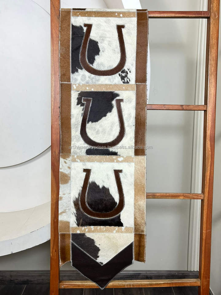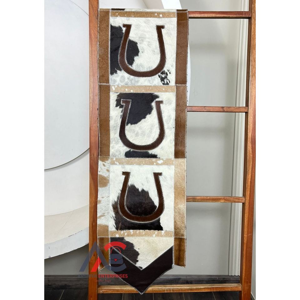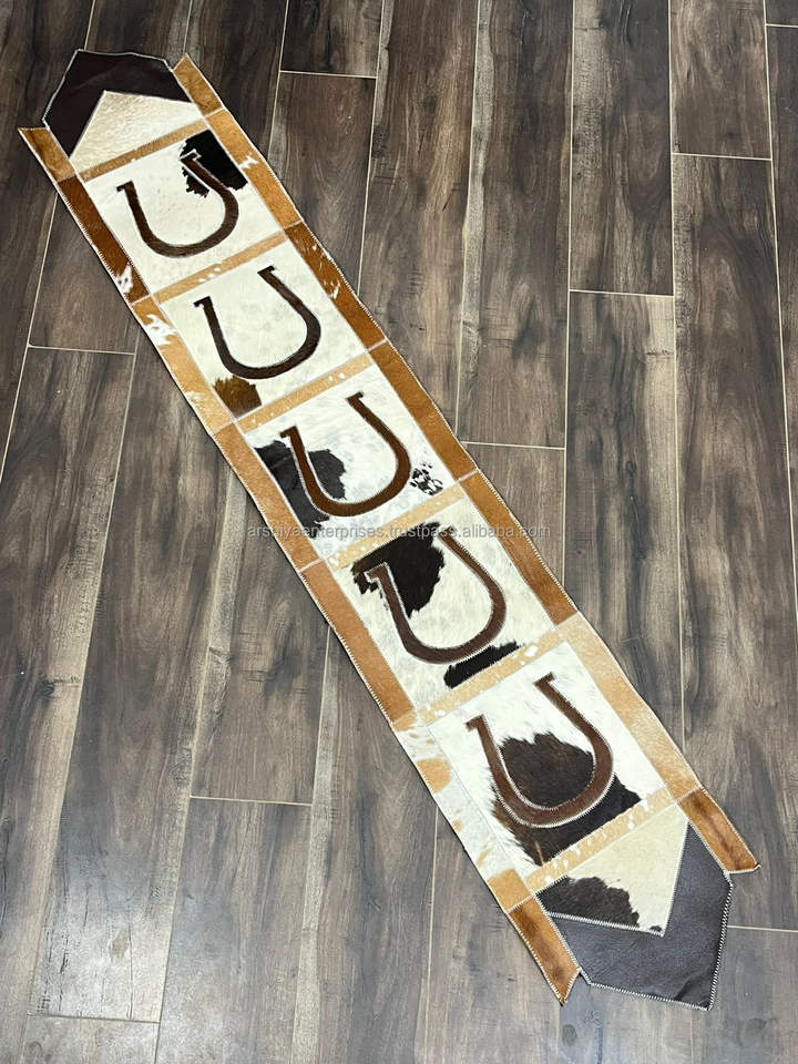 Premium Quality Genuine Cowhide Leather Patchwork Horseshoe Design Table Runner Rustic Home Decorative Dining Table Accessory