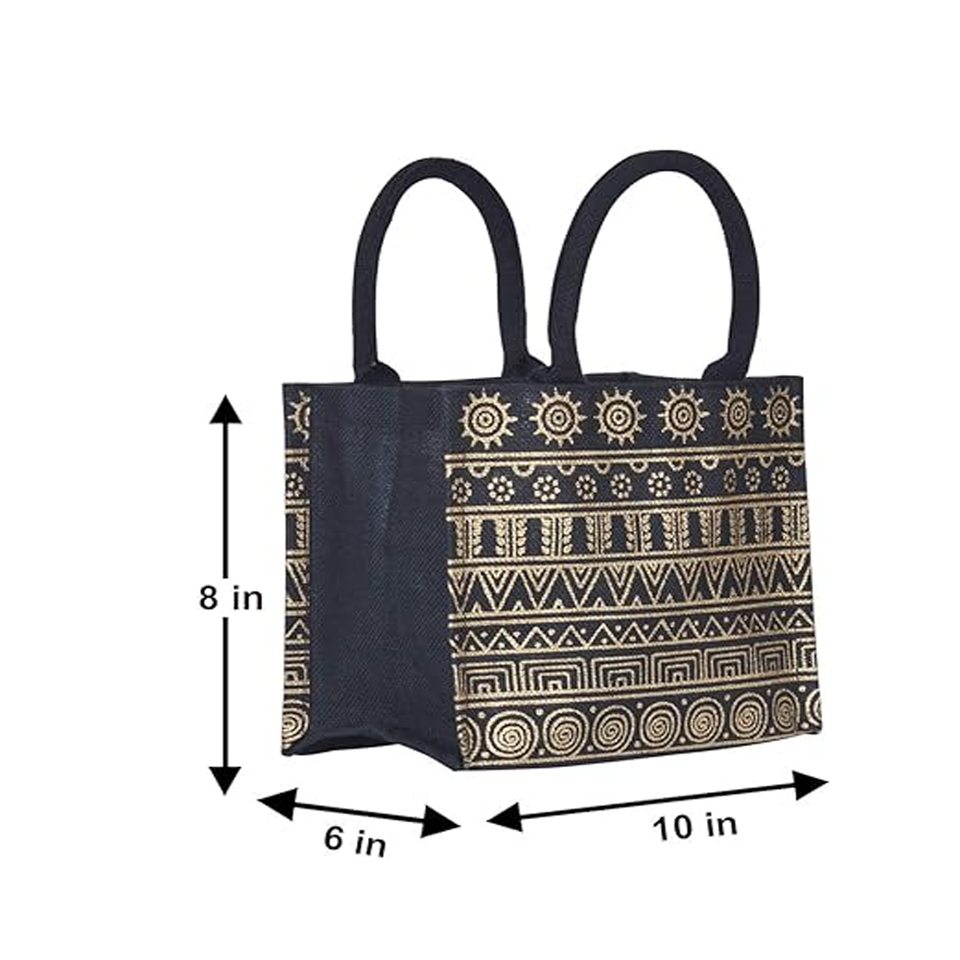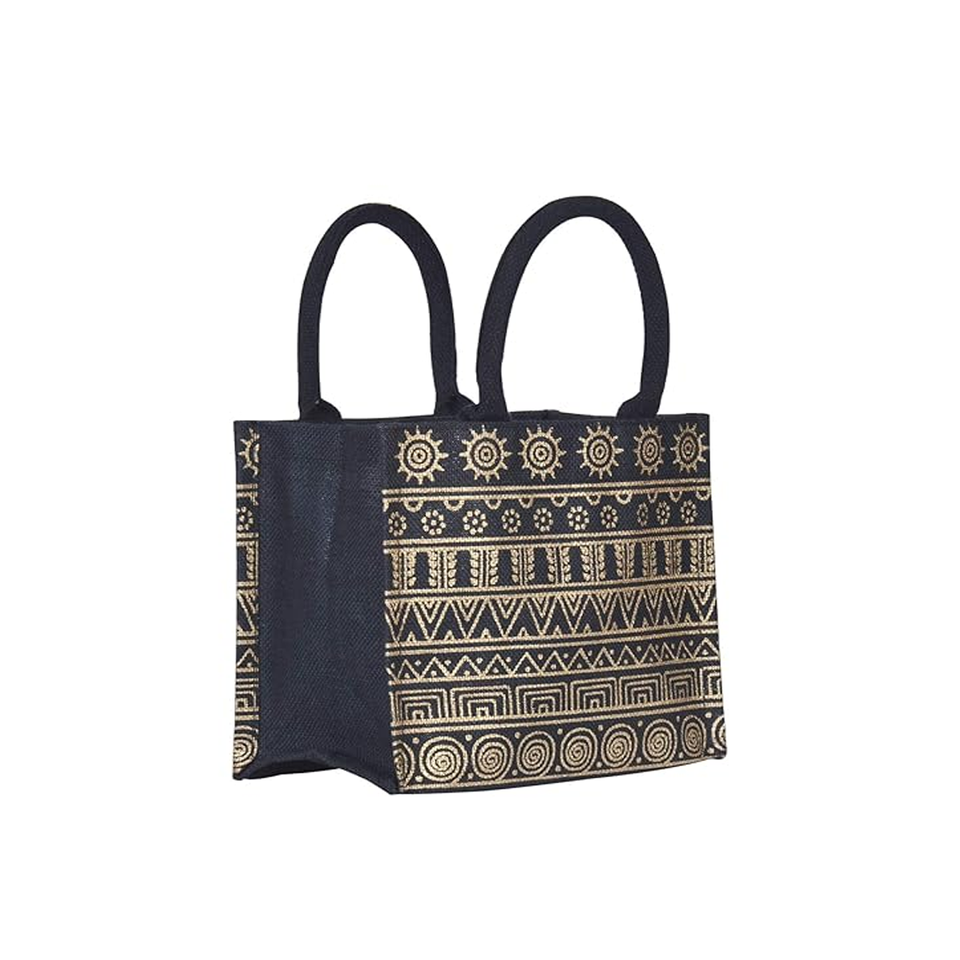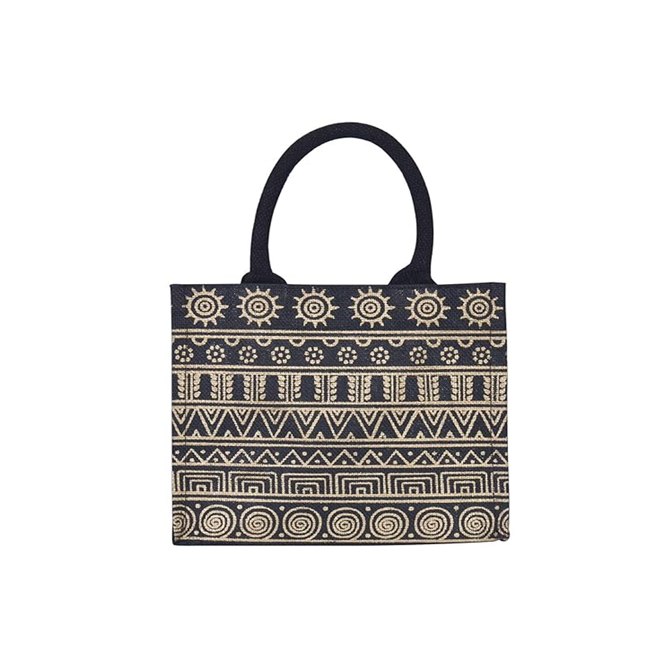 Premium Quality Jute Shopping Tote Bag Geometric Pattern Bohemian Fashion Style Easy Carry Padded Webbing Handle Strong Capacity