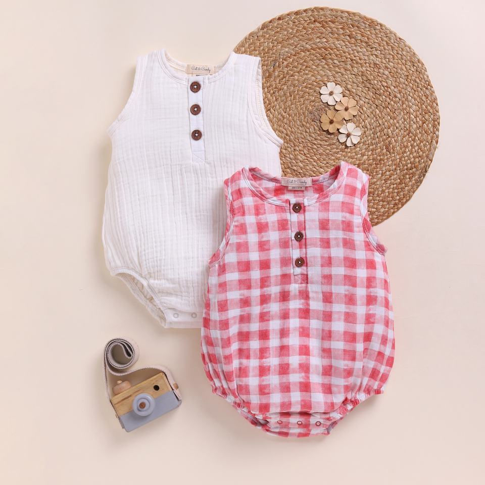 Premium Quality Organic Muslin Bubble Romper Pack of 2 Milk Pink Check Baby Outfit