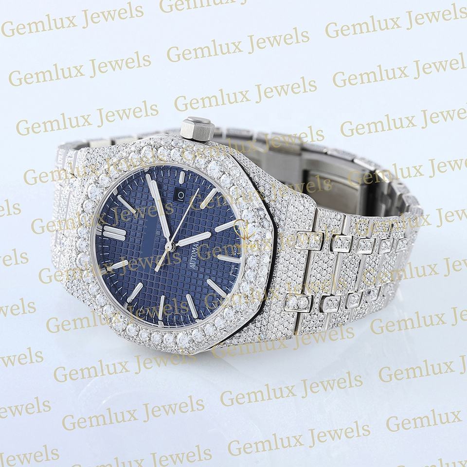 Premium Quality Pass Diamond Tester Full White Blue Dial D VVS Fully Iced Out Moissanite Diamond Auto Date Hip Hop Watch For Men