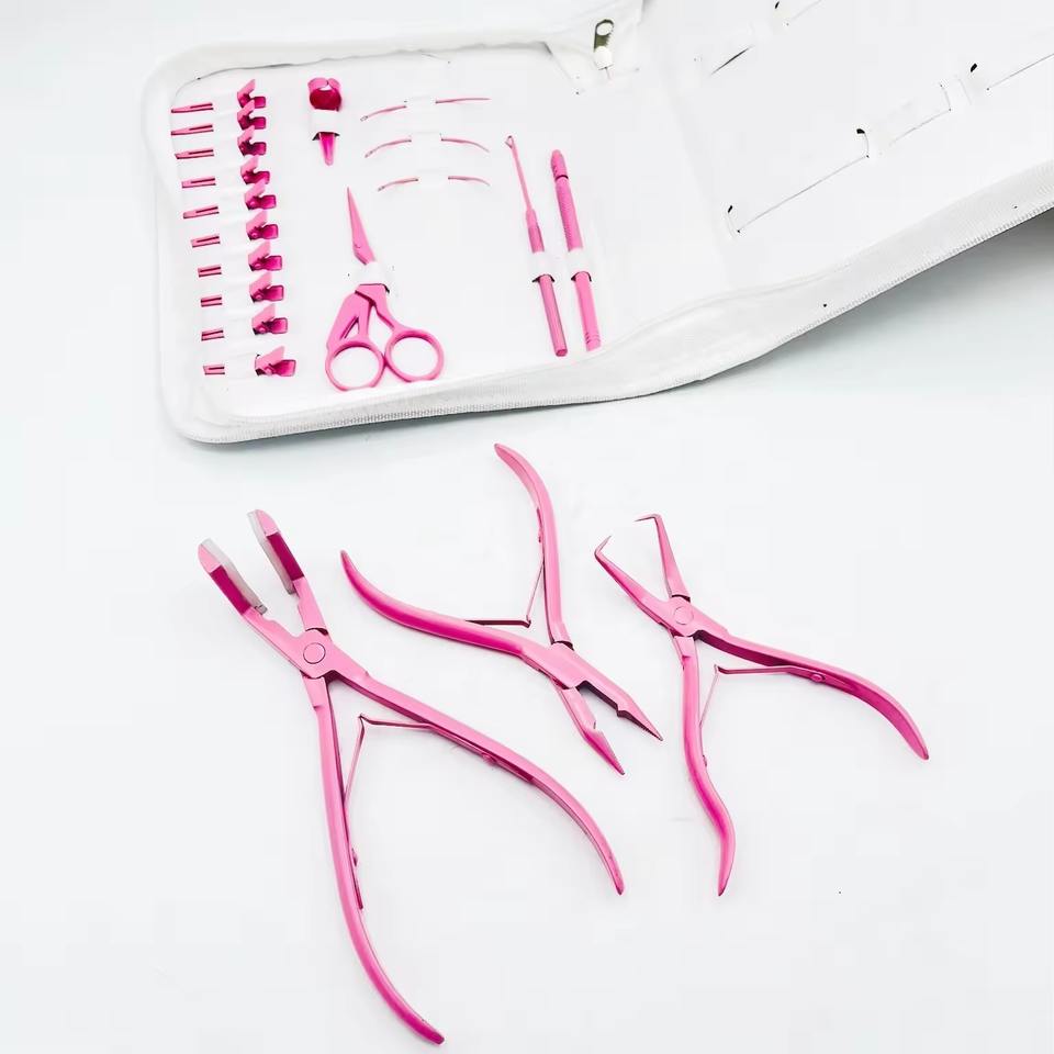 Premium Quality Pink Color Powder Cotted Hair Extension Tools Kit Hair Extension Tools Kit Pliers for Micro Ring Tools