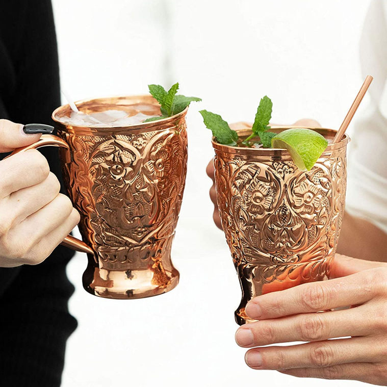 Premium Quality Pure Copper Moscow Mule Mugs Handcrafted embossed design Mugs Matt Finished for Beer, Wine, Soft Drink and Vodka