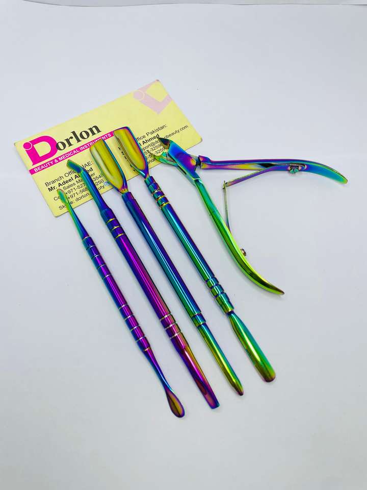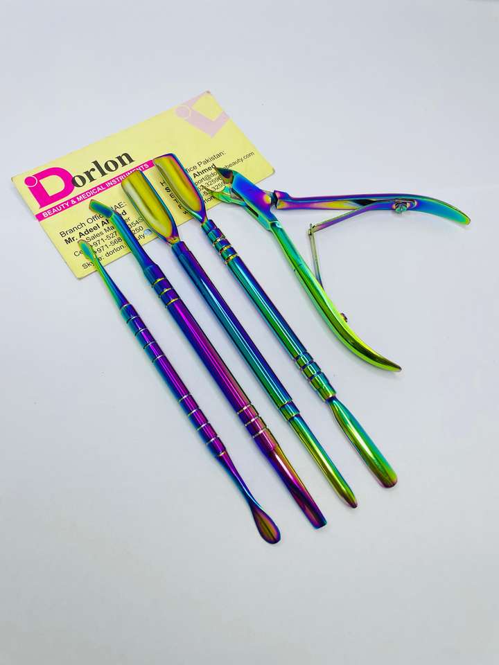 Premium Quality Rainbow Coated Stainless Steel Reusable Double Head Nail Cuticle Pusher Nail Nipper for Nail Cleaning