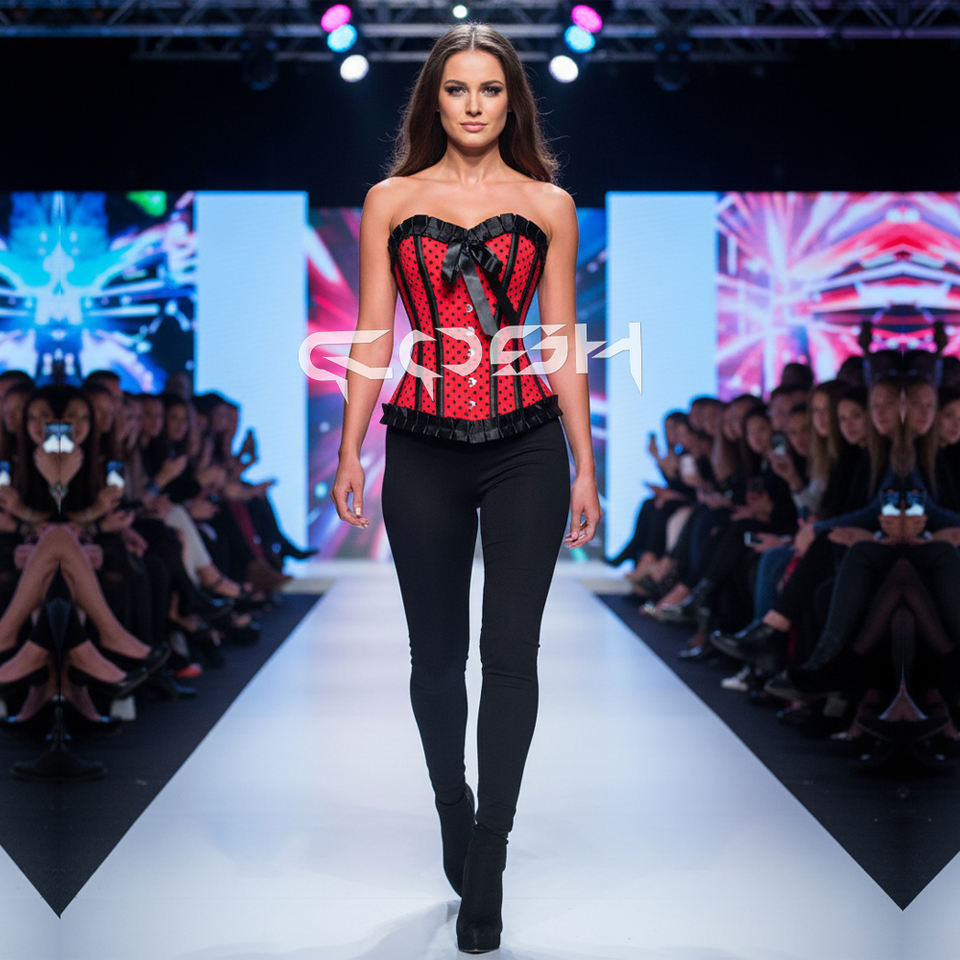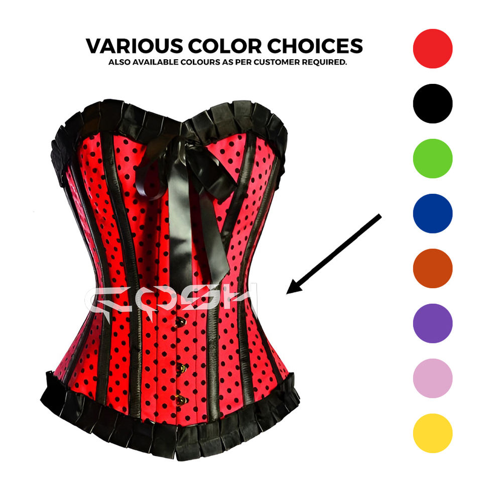 Premium Quality Red Satin Polka Dot Corset Top with Black Ruffle Trim & Ribbon Bow