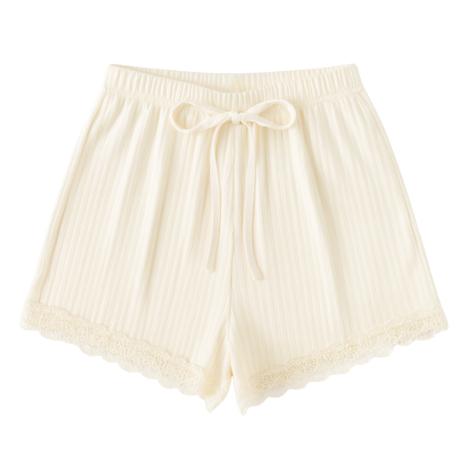 Premium Quality High Waist Ribbed Knit Lace Trim Elastic Quick Dry Breathable Lightweight Spandex/Polyester Lounge Casual Shorts