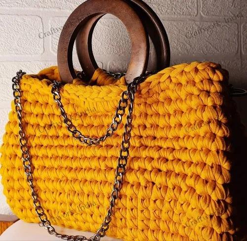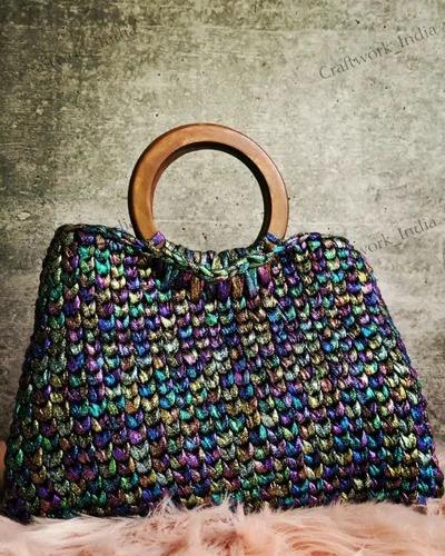 Premium Quality Royal Designer Wooden Top Handle Metallic Woven Knot Crochet Tote Bag for Daily Use Available At Best Price