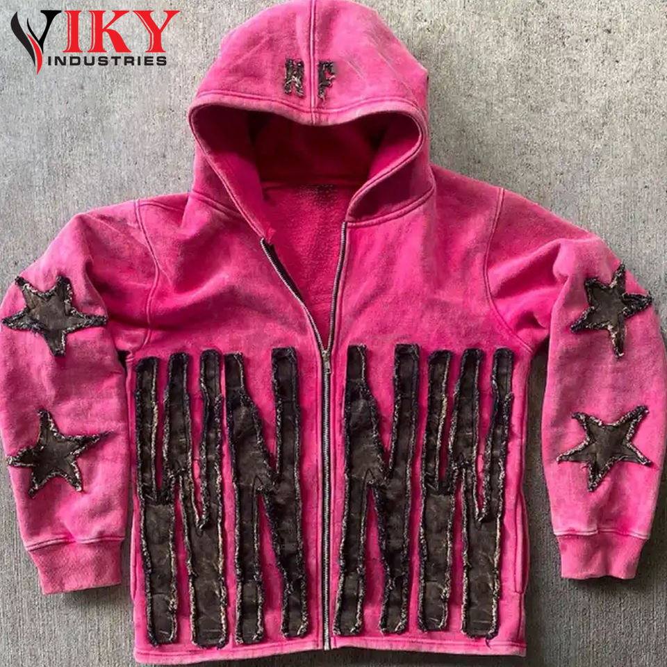 Premium Quality Vintage Applique Embroidered Acid Washed Distressed Zipper-Up Cotton Polyester Breathable Quick-Dry Hoodie Men