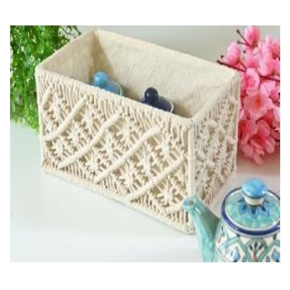 Premium Quality White Macrame Cotton Basket 11x7x5 Inch Handmade Storage Organizer Eco-Friendly Decorative Basket