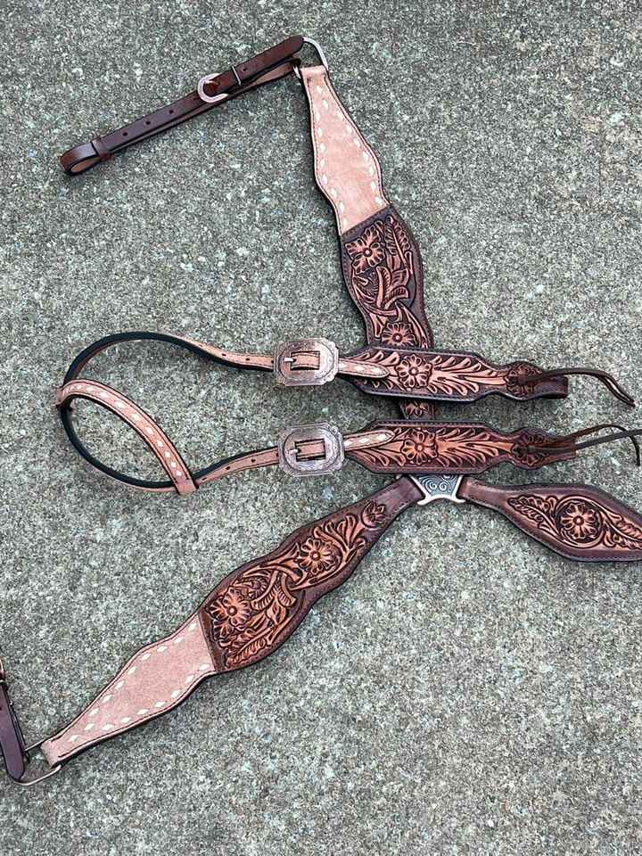 Premium Quality White Buck Stitch Floral Design Leather Headstall Breast Collar Set Wholesale Price Horse Products